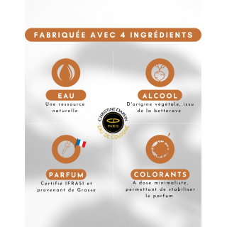 Fabriqué en France, dans la ville de Grasse, cette eau de Cologne imprègne chaque moment d'une odeur enivrante, persistante et captivante, pour une expérience sensorielle mémorable, laissant une empreinte authentique et raffinée où que vous alliez.